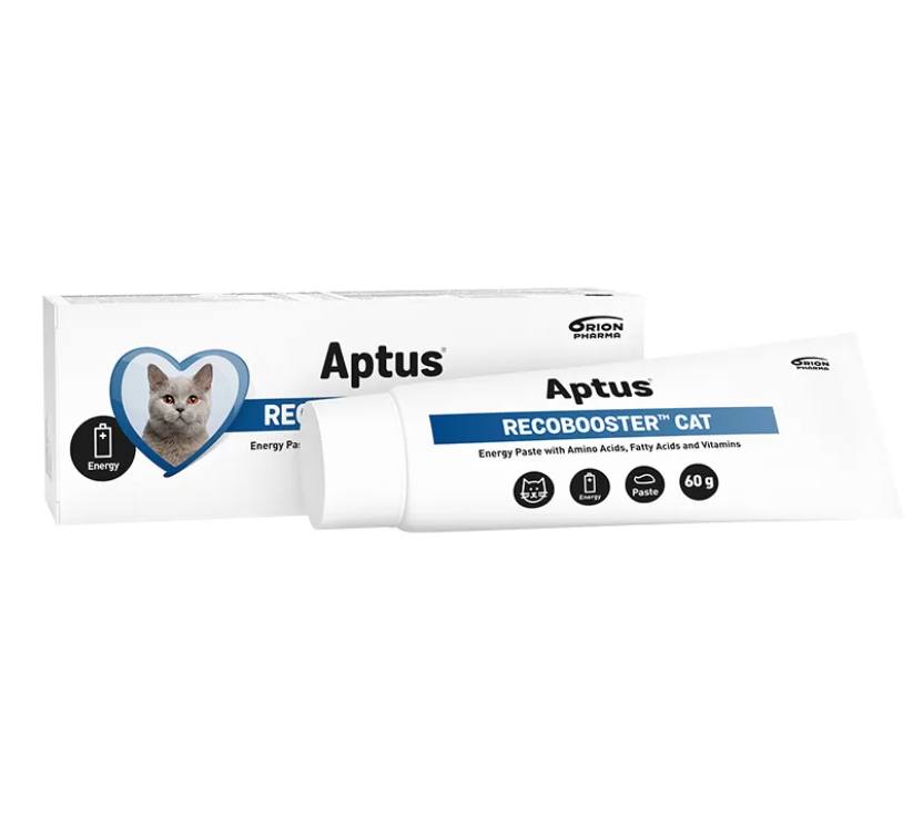 Aptus Recobooster Cat er et koncentreret tilskudsfoder til katte, udviklet til at støtte katten ved nedsat appetit, svækkelse eller under rekonvalescens. Pastaen har et højt energiindhold og er baseret på kyllingefedt, som giver katten letoptagelig energi, når behovet er størst.