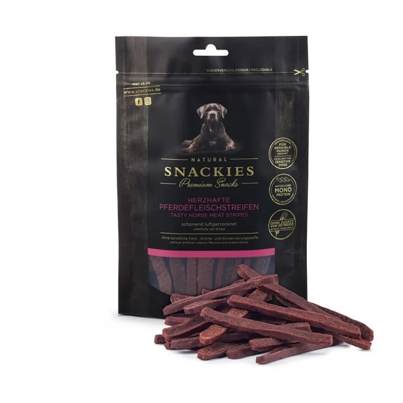 Forkæl din hund med velsmagende og sunde hestekødsstripes – 95% rent lufttørret kød, letfordøjelige snacks der bevarer den naturlige smag og er ideelle til hunde med fødevareallergi.