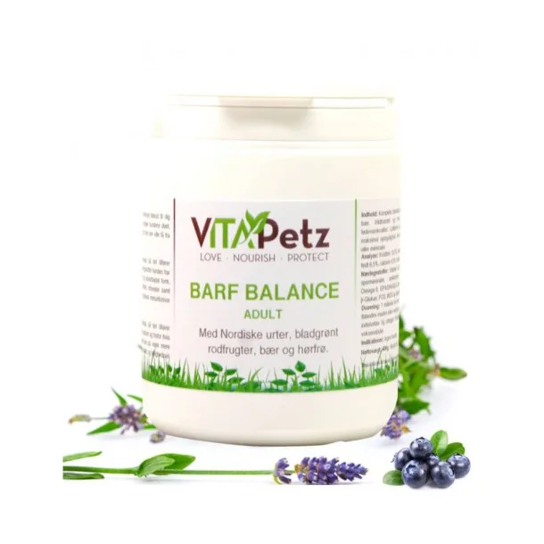 VitaPetz BARF Balance Adult er et 100 % naturligt og urtebaseret kosttilskud, udviklet specielt til voksne hunde, der fodres med BARF. Tilskuddet er skræddersyet til at understøtte hundens ernæringsmæssige behov og afspejler den naturlige sammensætning, hunden ville få gennem byttedyr i naturen – med urter, bær, frø, alger og grønt. Produktet er fremstillet af økologiske og vildthøstede råvarer og indeholder ingen kunstige vitaminer eller mineraler.